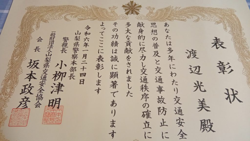 山梨県甲府市にある山梨県立文学館で開催された令和6年交通安全推進県民大会で『令和5年度交通安全功労者~山梨県警察本部長・山梨県交通安全協会会長連名表彰~』を頂きました。とても有り難い光栄な受賞です。感謝しますm(__)m