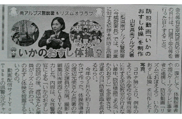 山梨県警察『南アルプス警察署』(今橋敦署長)、『峡西CATV』と協働制作した子どもたちの連れ去り・声掛け等から身を守る防犯動画『いかのおすし体操』が、全国の警察に配付されている『日刊警察』9月17日(金)「日刊警察新聞社」に掲載されました。感謝しますm(__)m リズムオブラブ♪の「元気で明るく安全なふるさと山梨創り」に共鳴していただいた心意気ある『南アルプス警察署』生活安全課員との互縁とお声掛けのお陰さまで、防犯動画協働制作が叶いました。 子どもたちが不審者(怪しい人・危ない人)から身を守るための防犯用語【いかのおすし】を覚えて言えることも大切ですが、実際に体現し実践できることが大切です! この動画は、動画配信サイトYouTubeの県警公式チャンネルで配信されています。また、南アルプス市にある小学校・幼稚園・保育所等を中心に配付されています。是非ご覧になって下さいね。 子どもが被害者となってしまう一瞬の事故・不慮の事件などから、子ども自身が自分の心と体を守れるようにするためには、【自己防衛意識】を醸成すると同時に、身の守り方・術の体得、【危険察知回避能力】の育成が急務です。